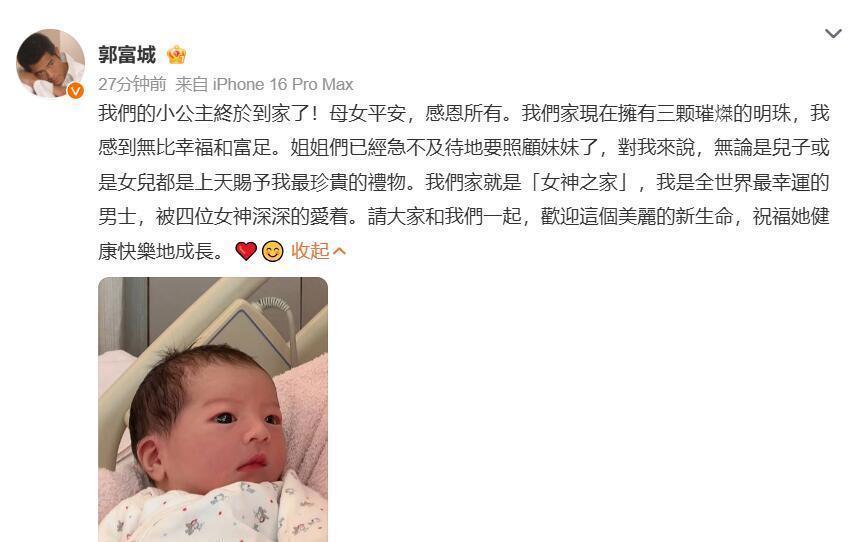 22日,郭富城在社交平台上宣布三胎得女,并晒出三胎女儿的近照!他发文称:“我们的小公主终于到家了!母女平安,感恩所有。我们家现在拥有三颗璀璨的明珠,我感到无比幸福和富足。